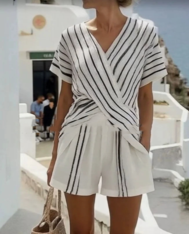 Casual V-Neck Short-Sleeve Striped Color-Block Shorts Two-Piece Set