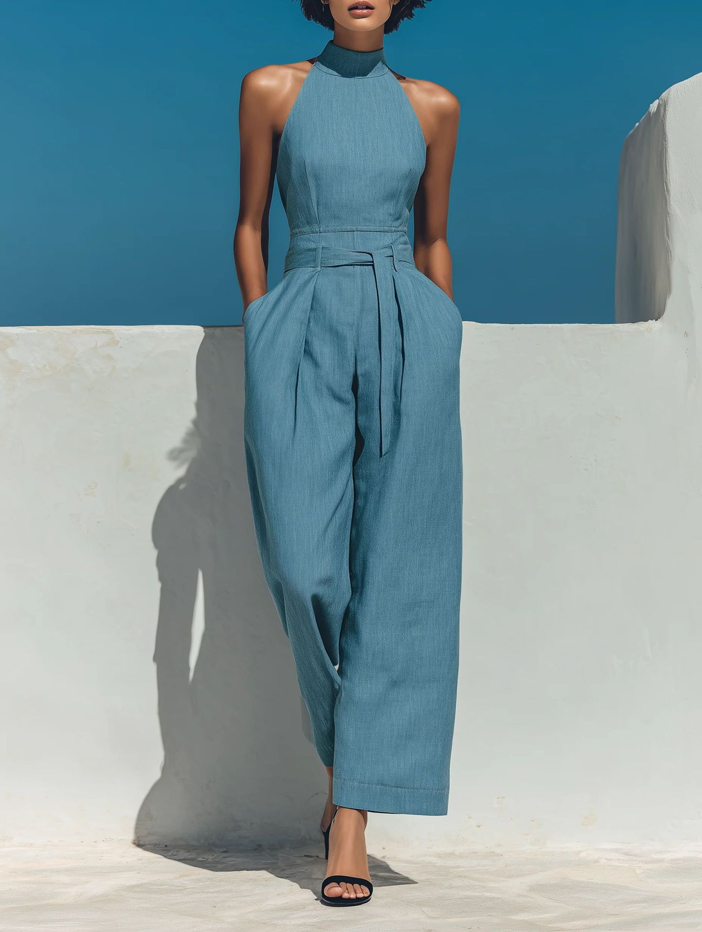 Summer One-shoulder Sleeveless Belted Jumpsuit